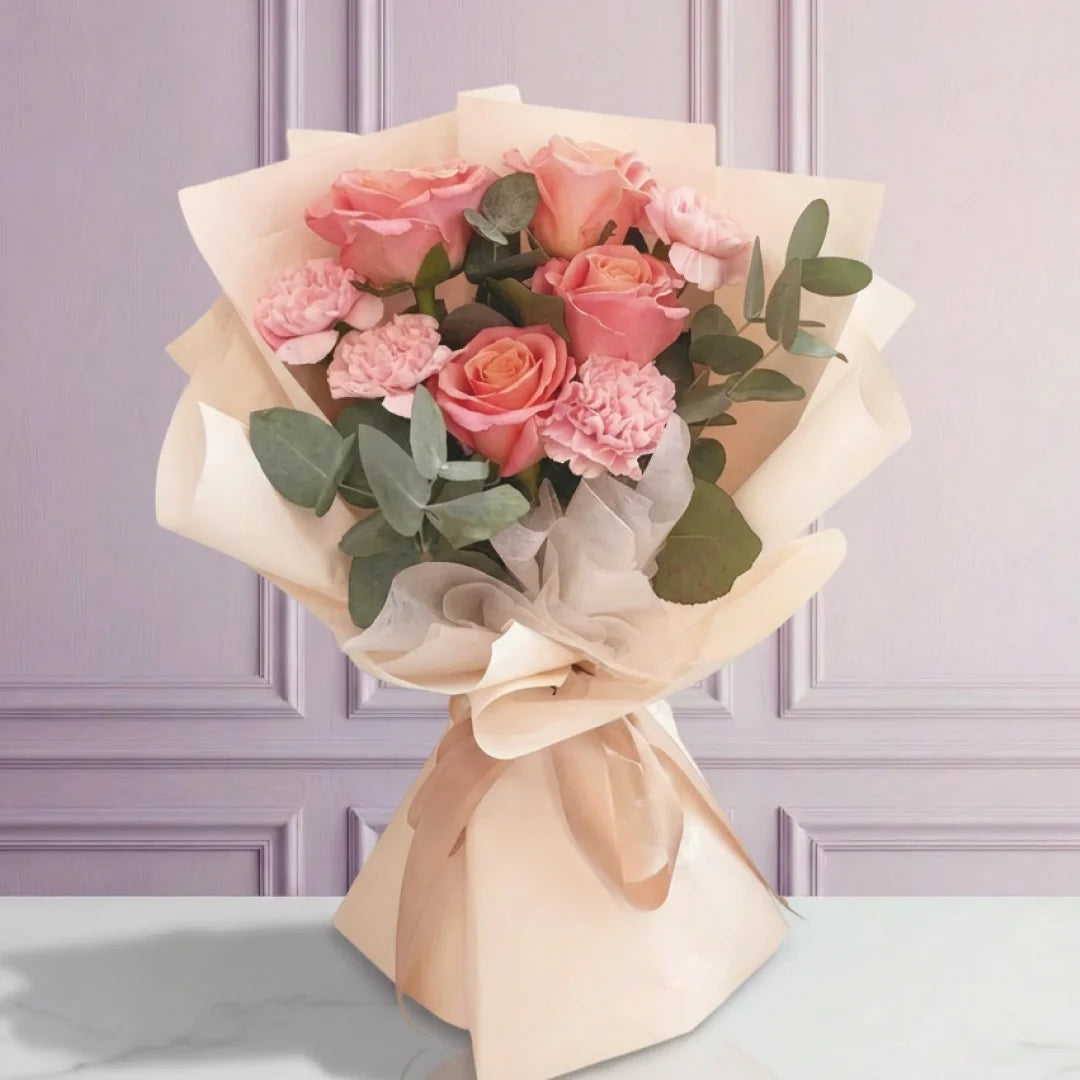 Ramo de rosas rosadas, claveles rosados y eucalipto. Un arreglo delicado y armonioso que destaca por sus tonos suaves y su estilo relajante. Perfecto para expresar ternura, cariño sincero y emociones serenas, ideal para regalar afecto en cualquier ocasión especial.