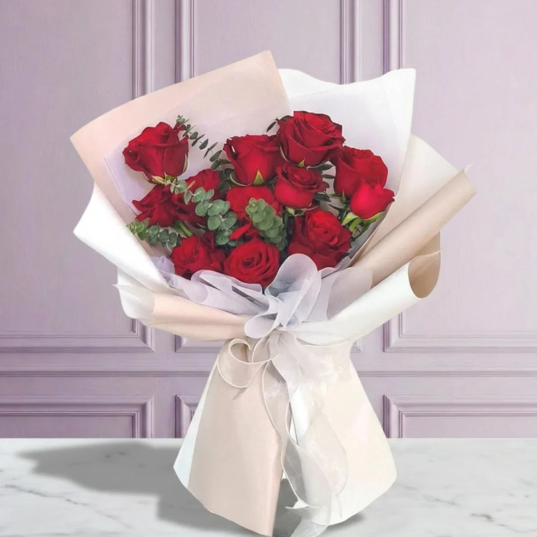 Ramo de rosas rojas con eucalipto. Un diseño clásico que combina la intensidad de las rosas rojas con el toque fresco del eucalipto, logrando un arreglo equilibrado y elegante. Ideal para transmitir amor profundo, compromiso y sentimientos que perduran en el tiempo.