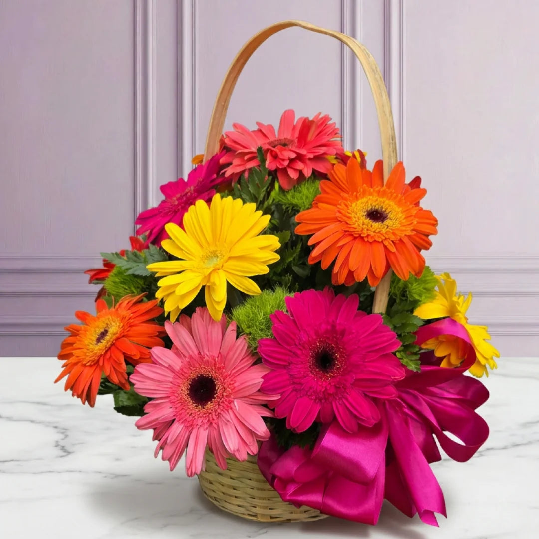 Canasta con gerberas de colores variados. Un arreglo alegre y expresivo que celebra la diversidad y el color. Perfecto para regalar energía positiva, optimismo y un toque de alegría en cualquier ocasión.