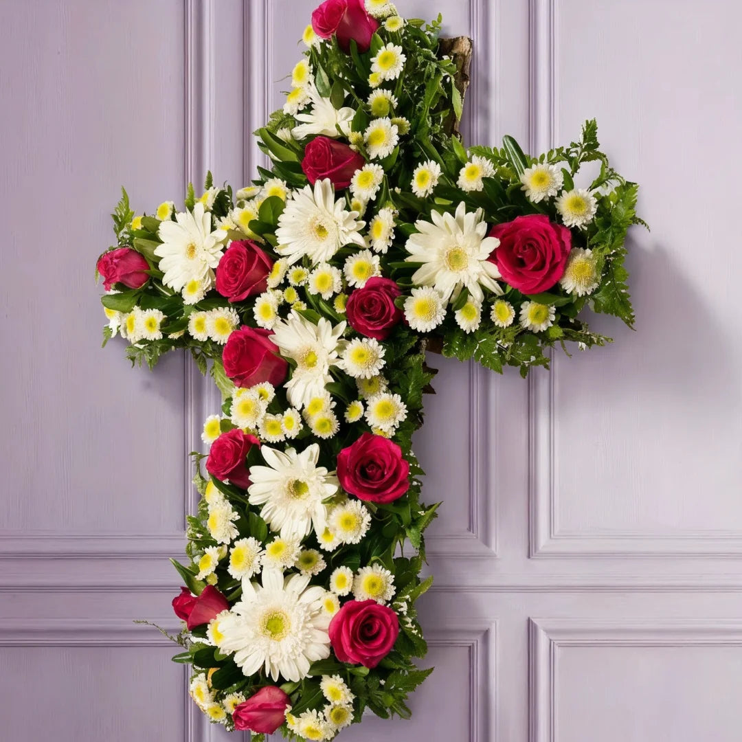 Arreglo floral en forma de cruz elaborado con gerberas blancas y rosas en tonos rosados o rojos, acompañado de follaje verde. Un diseño solemne que expresa respeto, recuerdo y acompañamiento en momentos de despedida.