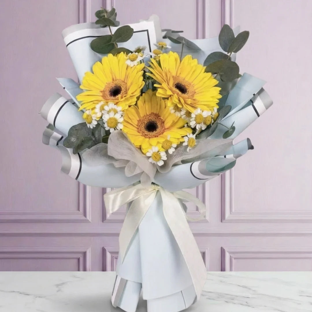 Ramo de gerberas amarillas con eucalipto. Un arreglo fresco y luminoso que transmite energía positiva y optimismo. Ideal para alegrar el día y llenar cualquier espacio de calidez.