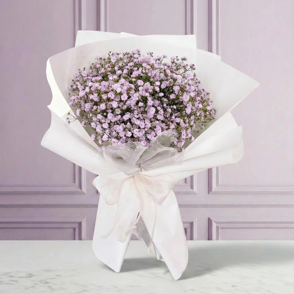 Ramo de baby breath teñido en tono morado. Un arreglo etéreo y delicado que destaca por su estilo soñador y original, perfecto para sorprender con un detalle diferente y elegante.
