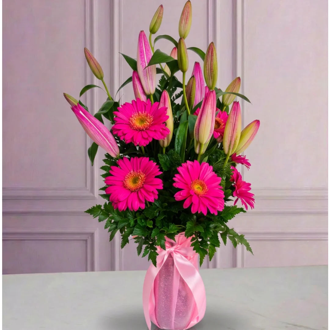 Arreglo que combina lirios rosados con gerberas fucsias y follaje fino. Un diseño armonioso que transmite ternura, alegría y frescura, ideal para expresar cariño y gratitud.
