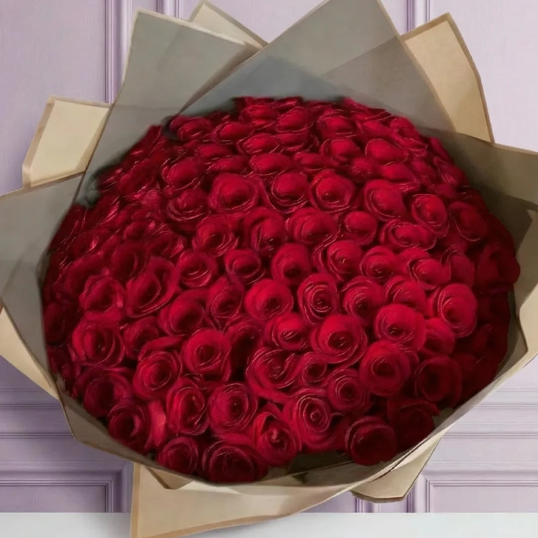 Imponente ramo de 100 rosas rojas que simboliza amor intenso y compromiso absoluto. Un gesto impactante pensado para ocasiones extraordinarias y declaraciones inolvidables. Diseñado para capturar corazones y dejar una impresión duradera en tu ser amado. Ideal para propuestas, aniversarios, o simplemente para decir 'Te amo' de la manera más impactante.