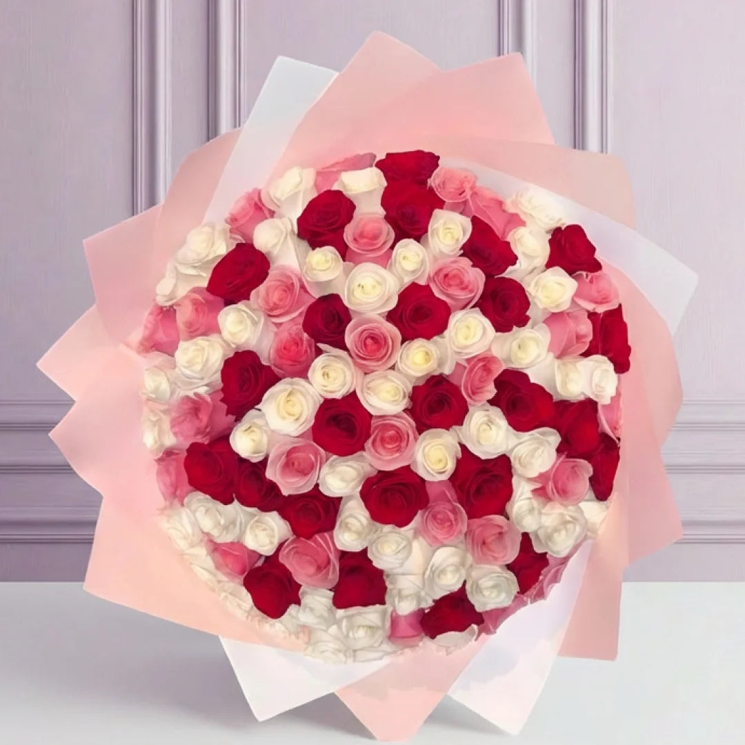 Ramo de 100 rosas en tonos rojo, rosado y blanco. Una combinación equilibrada que representa amor, admiración y armonía, perfecta para expresar emociones profundas con un diseño espectacular. Cada color cuenta una historia de amor, admiración y devoción, convirtiéndolo en el regalo ideal para expresar sentimientos profundos y duraderos en ocasiones especiales.